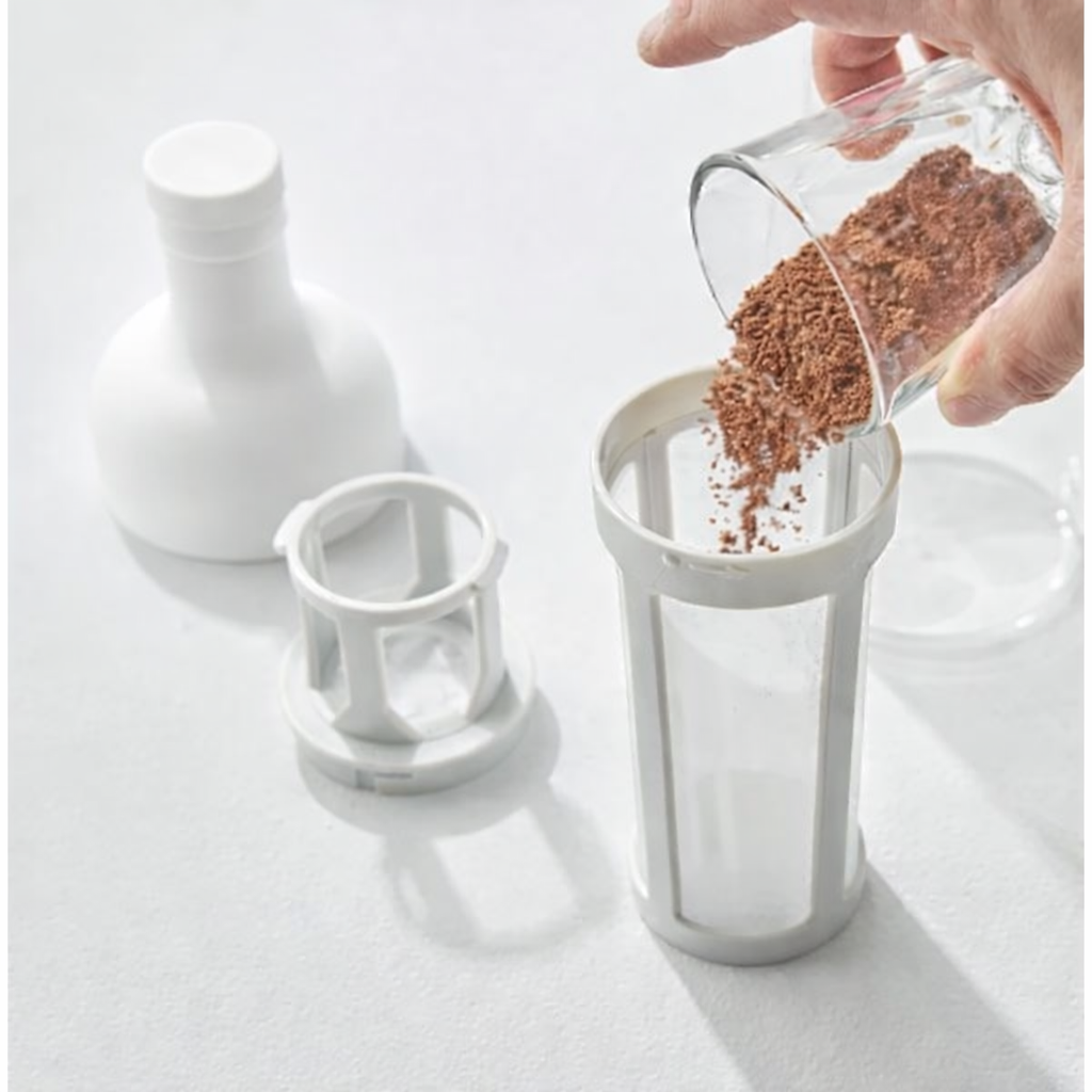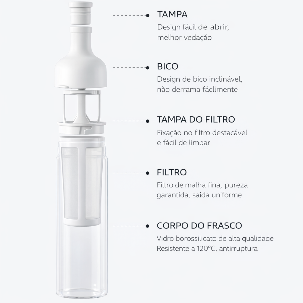 Produzida em vidro borossilicato resistente ao calor, garantindo durabilidade e preservando as características da bebida. Seu formato elegante permite preparar e servir o cold brew no mesmo recipiente.
